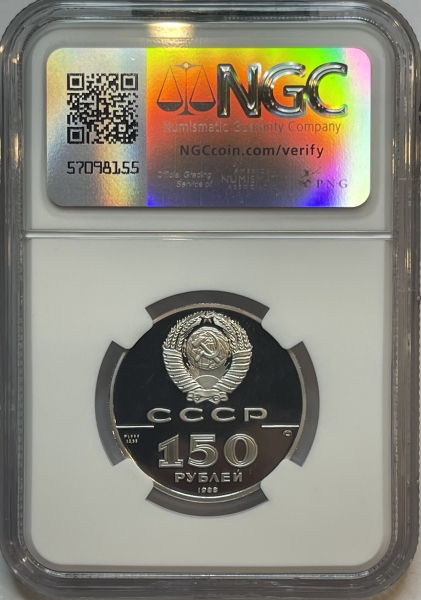 Сверху герб СССР с 15 витками ленты, под ним буквы «СССР», ниже слева и справа черта, под чертой слева химическое обозначение «Pt» и проба «999» металла из которого сделана монета, под ними чистый вес драгоценного металла «15,55», под чертой справа монограмма монетного двора «ЛМД», ниже обозначение достоинства монеты цифра «150» и ниже слово «РУБЛЕЙ», внизу у канта год выпуска монеты «1988».