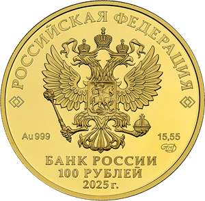рельефное изображение Государственного герба Российской Федерации, над ним вдоль канта – надпись полукругом «РОССИЙСКАЯ ФЕДЕРАЦИЯ», обрамленная с обеих сторон сдвоенными ромбами, под гербом слева – обозначения драгоценного металла и пробы сплава, справа – содержание химически чистого металла и товарный знак монетного двора, внизу в центре в три строки – надпись «БАНК РОССИИ», номинал монеты «100 РУБЛЕЙ», год выпуска «2025 г.».