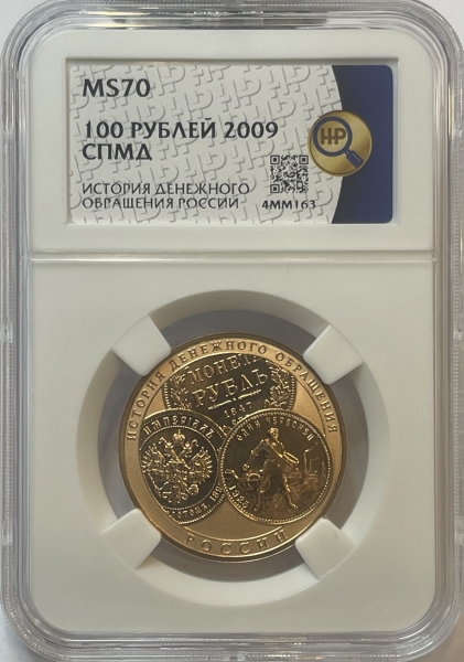 Золотая монета 100 рублей История Денежного Обращения в слабе ННР MS 70 , СПМД , 2009 г., 15,55 г.