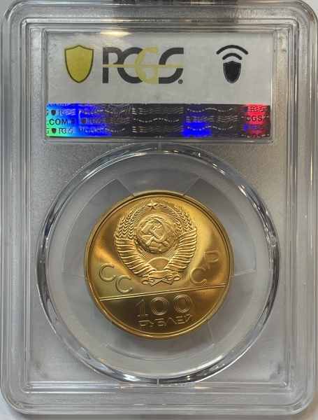Золотая монета 100 рублей "Факел" Олимпиада 80, 1980г., в слабе PCGS MS 70
