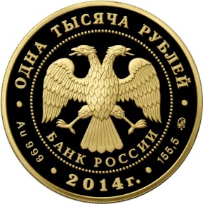 в центре – эмблема Банка России (двуглавый орёл с опущенными крыльями, под ним – надпись полукругом "БАНК РОССИИ"), обрамленная кругом из точек и надписями по кругу – вверху: "ОДНА ТЫСЯЧА РУБЛЕЙ", внизу: слева – обозначения драгоценного металла и пробы сплава, в центре – дата выпуска "2014 г.", справа – содержание химически чистого металла и товарный знак монетного двора.