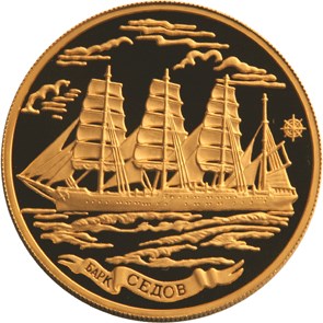 Золотая монета 1000 рублей "Барк Седов" 2001 год, 155,5 грамм