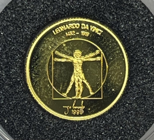 Золотая монета 1000 тугриков "Гений тысячелетия Леонардо да Винчи" 1999г., 1,24г., Au 999