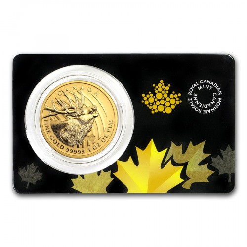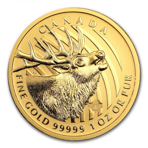 На реверсе изображен лось вапити – один из крупнейших представителей семейства оленей в мире. Внизу по ободу помещена надпись: «FINE GOLD 99999 1 OZ OR PUR» (1 унция золота пробы 0,99999 или чистого золота), вверху указана страна-эмитент – «CANADA» (Канада).