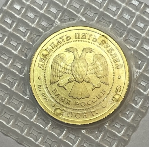 в центре диска - эмблема Банка России (двуглавый орел с опущенными крыльями, под ним надпись полукругом "БАНК РОССИИ"), обрамленная кругом из точек и надписями по кругу: вверху - "ДВАДЦАТЬ ПЯТЬ РУБЛЕЙ", внизу - "2003 г.", слева - обозначение металла, проба сплава, справа - содержание драгоценного металла в чистоте и товарный знак монетного двора.