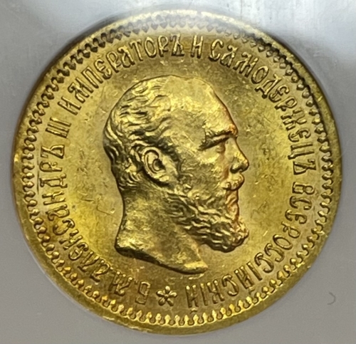 Золотая монета 5 рублей Александр III 1889 г. в слабе NGC MS 63