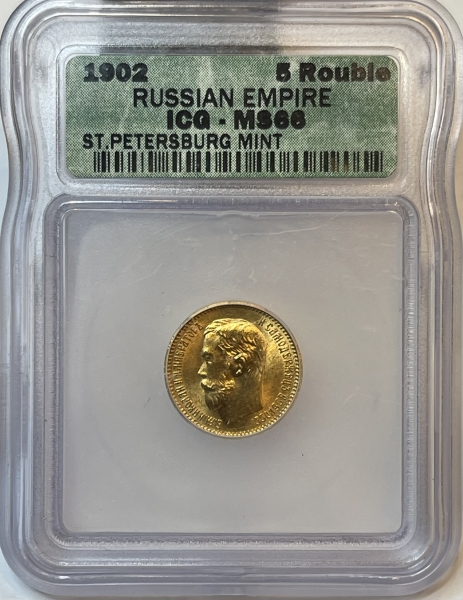 Золотая монета 5 рублей Николай II 1902 г. в слабе ICG MS 66