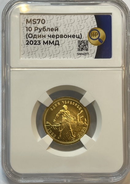 Золотая монета 10 рублей "Червонец Сеятель" ММД в слабе ННР MS 70, 2023 г.