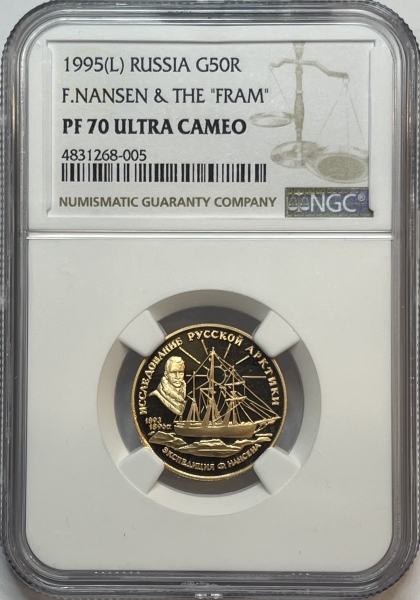 Золотая монета 50 рублей "Ф.Нансен" Исследование Русской Арктики 1995г.,7,78г., СПМД , Au 900 в слабе NGC PROOF 70 ULTRA CAMEO