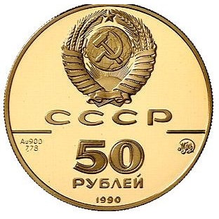 Сверху герб СССР с 15 витками ленты, под ним буквы «СССР», ниже слева и справа черта, под чертой слева химическое обозначение «Au» и проба «900» металла из которого сделана монета, под ними чистый вес драгоценного металла «7,78», под чертой справа монограмма монетного двора «ММД», ниже обозначение достоинства монеты цифра «50» и ниже слово «РУБЛЕЙ», внизу у канта год выпуска монеты «1990».