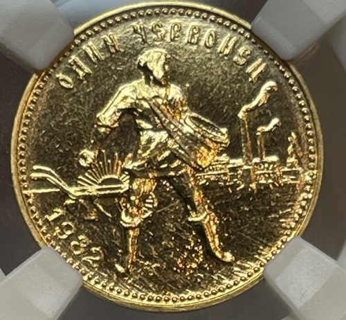 Изображение крестьянина-сеятеля на фоне плуга, восходящего солнца и заводов; по краю монеты точки, вверху надпись - «ОДИН ЧЕРВОНЕЦ», внизу слева — год выпуска - 1982.