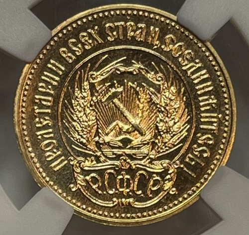 Герб РСФСР, окруженный венком из колосьев, и щит с изображением на нем серпа и молота на фоне солнечных лучей; по краю монеты точки вдоль них надписи: сверху - «ПРОЛЕТАРИИ ВСЕХ СТРАН, СОЕДИНЯЙТЕСЬ!», внизу под гербом - «Р. С. Ф. С. Р.».