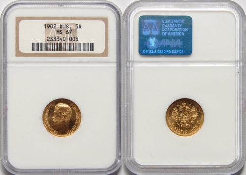 Золотая монета Николая II 5 рублей 1902 год Состояние MS 67