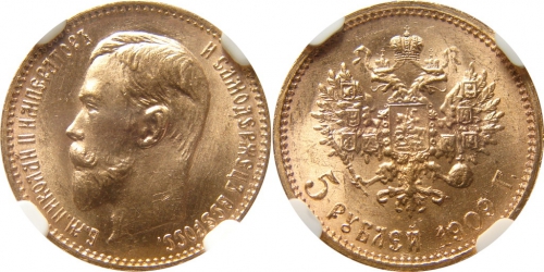 Золотая монета Николая II 5 рублей 1909 год Состояние MS 65